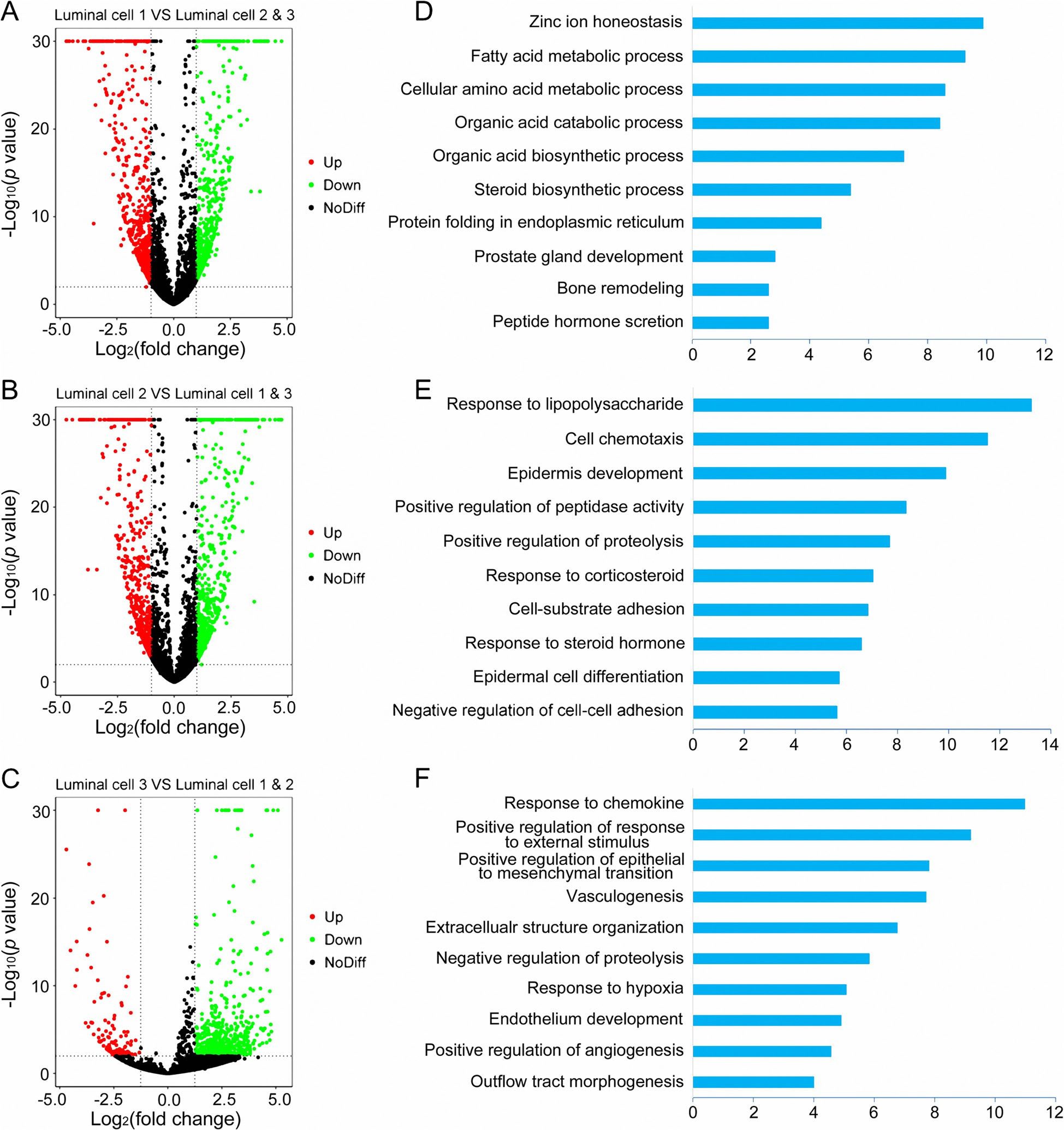 為了進(jìn)一步確定每個(gè)管腔簇在PCa發(fā)生和發(fā)展中的潛在作用,作者進(jìn)行了功能增強(qiáng)。1型管腔細(xì)胞上調(diào)的基因主要富集于參與癌癥進(jìn)展的代謝過程,如脂肪酸代謝過程、甾體生物合成過程和肽類激素分泌,表明1型管腔細(xì)胞確實(shí)是惡性細(xì)胞(圖3a,d)。2型細(xì)胞中蛋白水解酶和胞漿蛋白水解活性均為陽(yáng)性,提示細(xì)胞內(nèi)蛋白水解活性和2型細(xì)胞的高表達(dá)有關(guān)。有趣的是,2型管腔細(xì)胞中其他高表達(dá)的基因在正常前列腺發(fā)育過程中豐富,包括表皮發(fā)育、表皮細(xì)胞分化和對(duì)類固醇激素的反應(yīng)(圖3b,e)。綜合起來,2型管腔細(xì)胞被鑒定為惡性程度相對(duì)較低的細(xì)胞。為了進(jìn)一步驗(yàn)證這一觀點(diǎn),我們對(duì)從成對(duì)比較中獲得的每個(gè)亮度DEG進(jìn)行GO分析,并得到類似的結(jié)果。在3型管腔細(xì)胞中表達(dá)的上調(diào)基因主要參與腫瘤遷移相關(guān)的過程,如血管生成、上皮-間質(zhì)轉(zhuǎn)換的正調(diào)控和內(nèi)皮細(xì)胞的發(fā)育,表明3型管腔細(xì)胞也是惡性細(xì)胞(圖3c,f)。