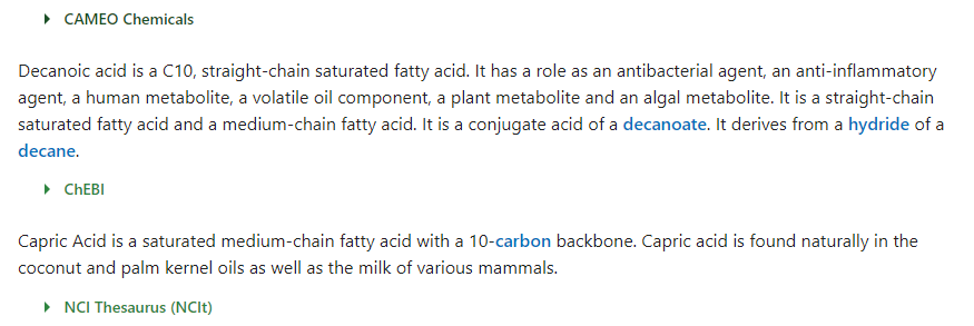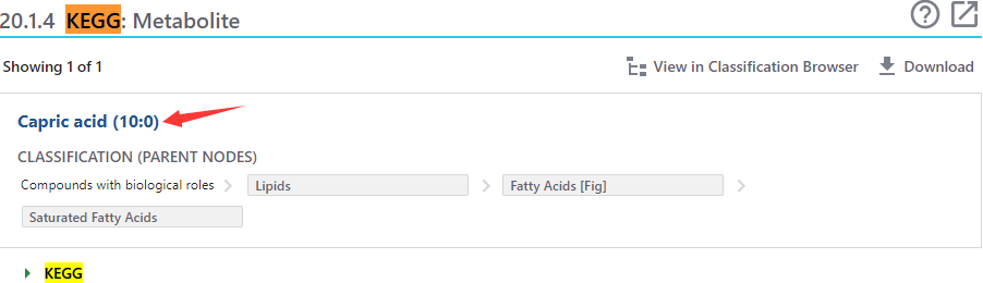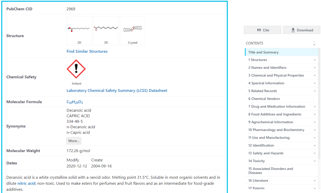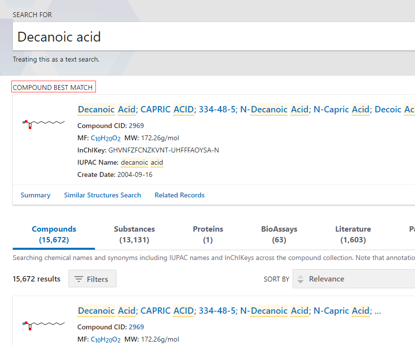 Pubchem(https://pubchem.ncbi.nlm.nih.gov/),它是NCBI下的一個(gè)大型的、綜合性的化合物數(shù)據(jù)庫,目前收錄了1億多種化合物信息,支持名稱、縮寫、化學(xué)式、系統(tǒng)命名等多種方式檢索,其結(jié)果包含了化合物的各種命名、相關(guān)聯(lián)的數(shù)據(jù)庫信息、結(jié)構(gòu)、分類、理化性質(zhì)、文獻(xiàn)、質(zhì)譜圖等多種信息。其中頁面開頭的摘要部分可快速了解到該物質(zhì)的特性、生物功能等信息,根據(jù)提供的文獻(xiàn)信息可幫助我們了解目前的研究情況。今天小編以“癸酸”為例教大家如何快速了解一個(gè)陌生的代謝組化合物。首先我們?cè)谥黜撍阉鳈谥休斎牍锼嵊⑽拿鸇ecanoic acid,點(diǎn)擊搜索后會(huì)得到多個(gè)結(jié)果,置頂?shù)囊话銥樽罴哑ヅ洌@里是完全一致的,可以確認(rèn)就是這個(gè)結(jié)果。