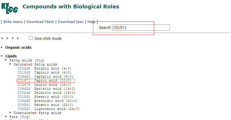 前文提到的KEGG(https://www.genome.jp/kegg/compound/)數(shù)據(jù)庫相信大家都不陌生,它是日本京都大學(xué)和東京大學(xué)聯(lián)合開發(fā)的數(shù)據(jù)庫。它有一個(gè)化合物庫,記錄了與通路相關(guān)的化合物,其化合物ID以C開頭,百邁客的分析結(jié)果提供了這個(gè)信息。這里我們將上述得到的C01571進(jìn)行檢索: