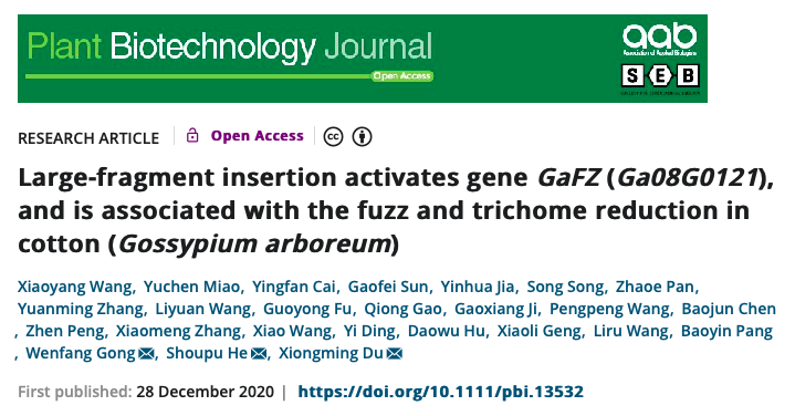 Wang X, Miao Y, Cai Y, et?al. Large-fragment insertion activates gene GaFZ?(Ga08G0121), and is associated with the fuzz and trichome reduction in cotton (Gossypium arboreum). Plant Biotechnol J. 2020 Dec 28.