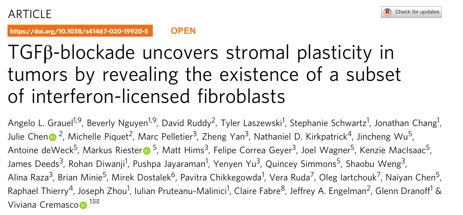 總之,這些數(shù)據(jù)表明,TGFβ-阻斷可導致小鼠和人類腫瘤成纖維細胞的重塑,暴露了一種獨特的CAF群體的誘導,其特征是對IFN的明顯反應和相當大的免疫調節(jié)潛能。
