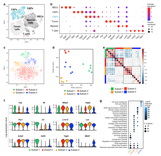 1.?單細胞RNAseq分析揭示了癌癥相關成纖維細胞不同亞群的存在