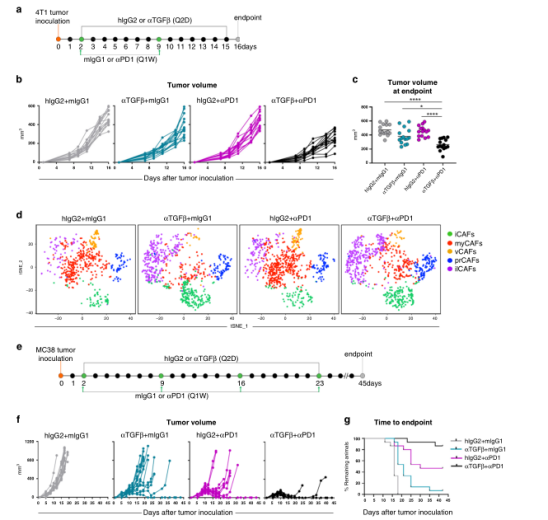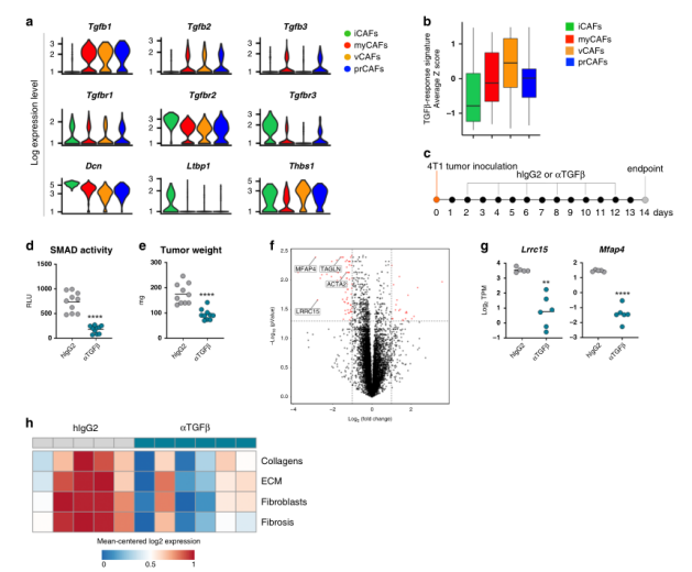 綜上所述,這些數(shù)據(jù)促使我們研究TGFβ-阻斷劑在體內對CAF表型和功能的相對影響。為此,6周齡雌性小鼠接種4T1腫瘤細胞,隨后用TGFβ阻斷抗體或同型對照處理,研究設計如圖2c所示。結果表明這種腫瘤進展的延遲似乎不是由抗TGFβ對腫瘤細胞的直接作用引起的,更可能是TGFβ阻斷后微環(huán)境變化的結果。事實上,使用TGFβ中和抗體可導致整體基因表達的顯著差異,這在對大量冷凍腫瘤RNAseq分析中得到證實(圖2f)。與這些發(fā)現(xiàn)一致的是,我們通過分析與膠原沉積和纖維化相關的基因特征,描述了抗tgfβ治療小鼠腫瘤中整體促纖維化程序的顯著減少(圖2h)。綜上所述,這些數(shù)據(jù)表明靶向TGFβ影響了腫瘤微環(huán)境中的成纖維細胞動力學。