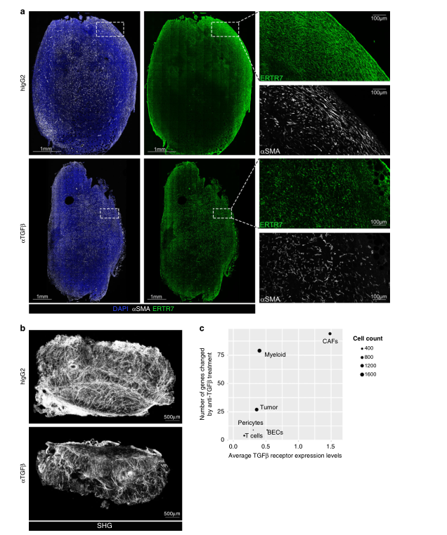 根據(jù)觀察到的基因表達變化,作者利用冷凍保存的腫瘤從同型或抗tgfβ處理小鼠切片,染色和共聚焦顯微鏡成像等方法確定了TGFβ-阻斷是否對構成腫瘤建筑框架結構產生損傷。Acta2表達的鏡像變化,肌成纖維細胞網(wǎng)絡的顯著改變,細長的紡錘形細胞稀少等揭示了瘤內結構組織的顯著變化,表明TGFβ阻斷抗體處理小鼠的高網(wǎng)狀纖維網(wǎng)絡丟失(圖3a)。通過對全器官的斷層掃描,進一步證實了膠原骨架形成的整體損傷,如圖3b所示。單細胞RNAseq分析結果表明基因的數(shù)量受anti-TGFβ治療明顯更大 (圖3 c),也與先前的結果一致。