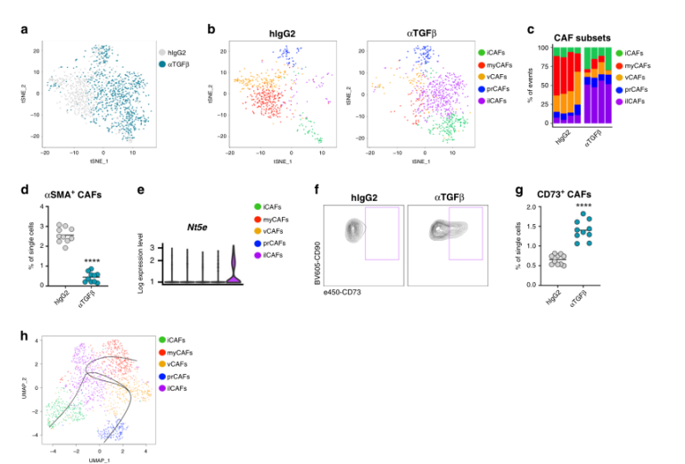 5.?TGFβ-阻斷導致myCAFs的丟失和CD73 +成纖維細胞的出現(xiàn)