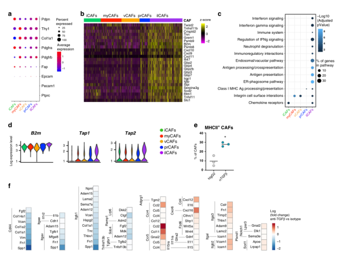 為了獲得關于新鑒定的CAF亞群功能特性的更多信息,作者研究了這類亞群的轉錄特征。然而,對ilCAFs中差異表達基因分析發(fā)現(xiàn),在干擾素(IFN)信號控制下許多鳥苷晚結合蛋白(Gbp)家族成員發(fā)生富集(圖5b)。與這些發(fā)現(xiàn)一致的是,在區(qū)分ilCAFs與其他CAF亞群的基因中, ilCAFs中IFN信號反應上調,IFN水平調控的通路增強,包括抗原加工和展示(圖5c)。編碼MHC蛋白和MHC相關分子的基因在ilCAFs中高表達(圖5b-d)。體內TGFβ-阻斷后,在CAFs中檢測到MHCII蛋白上調(圖5e),也發(fā)現(xiàn)ilCAFs在腫瘤內對指導T細胞的轉運發(fā)揮重要作用(圖5b)。