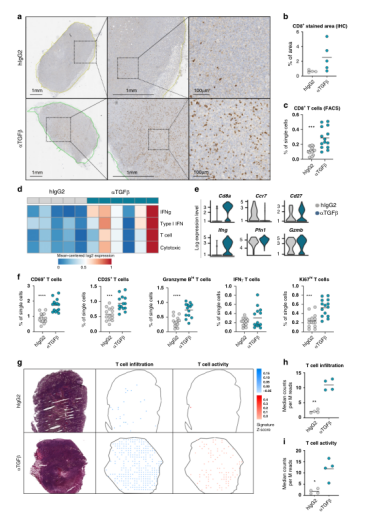 TGFβ-中和后CAF重塑,特別是具有潛在T細胞調節(jié)活性的CAF亞群的出現(xiàn),促使我們確定TGFβ-阻斷對建立抗腫瘤免疫反應的影響。由于ilCAFs中T細胞趨化分子基因表達升高,CD8免疫組化染色顯示細胞毒性T細胞浸潤在治療組之間存在較大差異(圖6a)。流式細胞分析證實了TGFβ-阻斷作用下細胞毒性T細胞數(shù)量的增加(圖6c),支持TGFβ-阻礙可能導致免疫細胞反應的全面覺醒。在單細胞水平上也證實了這些發(fā)現(xiàn)。為了評估這種與浸潤T細胞組織分布相關的激活程度,我們隨后通過空間轉錄組分析生成了與T淋巴細胞存在及其活性相關基因的腫瘤路圖。