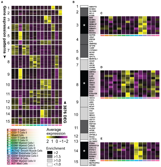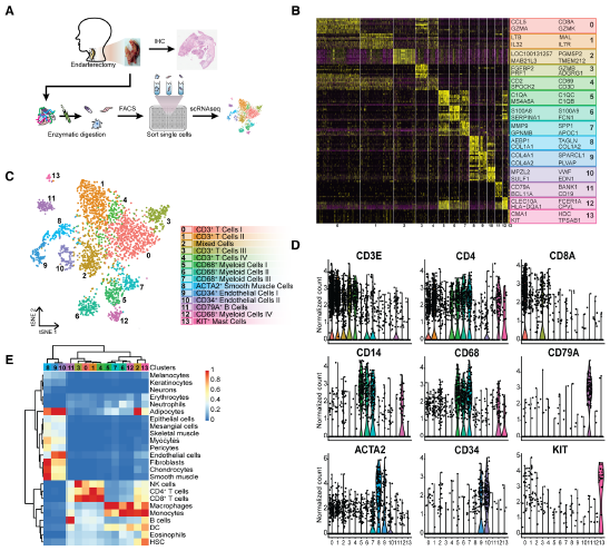 我們觀察到3個(gè)非免疫細(xì)胞簇(簇8,9和10;表達(dá)CD34和ACTA2[肌動(dòng)蛋白α2,平滑肌])和11個(gè)白細(xì)胞簇(圖1B和1D)。后者包括5個(gè)淋巴細(xì)胞簇(第0、1、3、4、11簇;表達(dá)CD3E、CD4、CD8、CD79A),5個(gè)髓系簇(第5、6、7、12和13簇;表達(dá)CD14、CD68、KIT),和1個(gè)沒(méi)有明確的細(xì)胞類(lèi)型表達(dá)譜的混合細(xì)胞的簇(第2簇),但與其他簇有相似的基因表達(dá),似乎主要含有凋亡的髓系細(xì)胞和T細(xì)胞(圖1B和1D)。T細(xì)胞是我們數(shù)據(jù)集中豐富的群體,占所有分析細(xì)胞的52.4%,而髓系群體占所有細(xì)胞的18.5%。