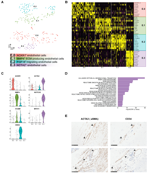 對(duì)ECs群集進(jìn)行分離和重新聚類(lèi)后,發(fā)現(xiàn)了4個(gè)不同的子類(lèi)(E.0-E.3,圖2A)。我們通過(guò)標(biāo)記基因?qū)C表型分為不同的亞類(lèi)(圖2B)。在E0小鼠中,ACKR1有明顯的表達(dá),ACKR1與靜脈內(nèi)皮細(xì)胞和血管相關(guān),PRCP參與了血管生成和受損內(nèi)皮細(xì)胞的再生(圖2B和2C)。E.1表達(dá)細(xì)胞外基質(zhì)基因,E.2表達(dá)細(xì)胞遷移標(biāo)記FGF18和HEG1,這兩個(gè)群體都表達(dá)VCAM1,它在激活的內(nèi)皮細(xì)胞表達(dá),促進(jìn)白細(xì)胞(如單核細(xì)胞和T細(xì)胞)的黏附和遷移(圖2C)。這表明E.0、E.1和E.2代表著激活的內(nèi)皮細(xì)胞,它通過(guò)細(xì)胞黏附和新生血管以及介導(dǎo)白細(xì)胞外滲,積極活躍地加重晚期病變的炎癥。值得注意的是,E.3亞群表達(dá)典型的SMC標(biāo)記物,如ACTA2、NOTCH3和MYH11 (圖2C)。