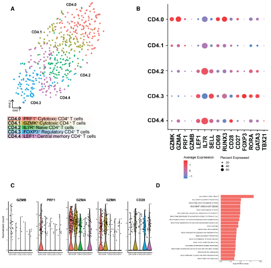 為了更詳細(xì)地定義T細(xì)胞,我們分離和重新聚類(lèi)CD4+T細(xì)胞,發(fā)現(xiàn)了5個(gè)亞類(lèi)(CD4.0-CD4.4,圖3A),其中主要的區(qū)別是它們的激活狀態(tài),而不是通常用于定義CD4+T輔助亞群的轉(zhuǎn)錄因子和細(xì)胞因子(圖3B和3C)。CD4.0和CD4.1具有細(xì)胞毒基因表達(dá)譜,此外,這一簇中的基因表達(dá)證實(shí)了與適應(yīng)性免疫反應(yīng)相關(guān)的促炎通路的富集(圖3D)。