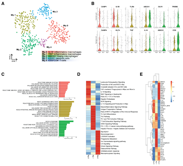 我們分離和重新聚類(lèi)動(dòng)脈粥樣硬化性髓系細(xì)胞,揭示了5種不同的表型(My.0-My.4,圖4A)。My.0、My.1和My.2很可能代表不同激活狀態(tài)的巨噬細(xì)胞。促炎標(biāo)志物基因(圖4B)以及免疫和炎癥通路的富集結(jié)果(圖4C)表明,My.0和My.1亞類(lèi)由促炎巨噬細(xì)胞組成。My.0顯示了最近招募的巨噬細(xì)胞的特征(圖4C,D),表明共表達(dá)的炎癥體被激活(圖4B)。與My.0和My.1相比,My.2缺乏明顯的促炎標(biāo)志物,并顯示巨噬細(xì)胞和泡沫細(xì)胞的跡象。