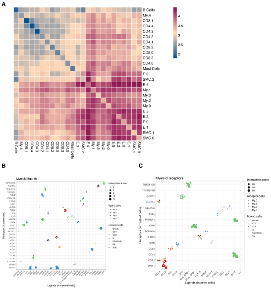 隨后,我們按髓系配體(圖5B)和受體(圖5C)明確地檢查了髓系群體中獨(dú)特的相互作用。發(fā)現(xiàn)了多種趨化作用,包括內(nèi)皮ACKR1與髓系來(lái)源的CCL2、CXCL8、CCL8和CXCL1的相互作用,其中最后兩個(gè)配體在My.1中特異性表達(dá)。我們還觀察到在所有髓系亞群中的CSF1R,與在內(nèi)皮細(xì)胞、平滑肌細(xì)胞、肥大細(xì)胞和髓系細(xì)胞中的CSF1有相互作用。