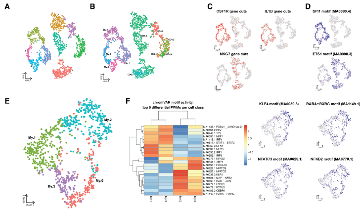 利用scATAC-seq,我們檢測(cè)了人類(lèi)斑塊中髓系和T細(xì)胞的開(kāi)放染色質(zhì)啟動(dòng)子和增強(qiáng)子圖譜。我們用scATACseq鑒定了4個(gè)髓系細(xì)胞簇和5個(gè)T細(xì)胞簇 (圖6A和6B)。巨噬細(xì)胞(CSF1R,IL1B)和T細(xì)胞特異性基因(NKG7)的開(kāi)放染色質(zhì),以及巨噬細(xì)胞和T細(xì)胞(SPI155和ETS156)的細(xì)胞型TFs的motif的富集,明確了細(xì)胞類(lèi)型之間的劃分界限(圖6C和6D)。轉(zhuǎn)移的髓系群體被重新聚類(lèi),類(lèi)似于scRNA-seq簇(圖6E)。