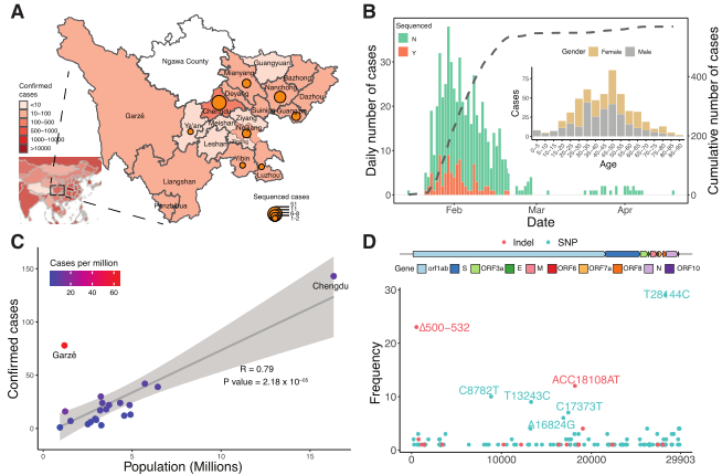 與20家醫(yī)院和研究機構(gòu)合作,分析了在2020年1月22日至2月20日期間在中國四川省收集的流行病學(xué)、遺傳和臨床數(shù)據(jù)。2020年1-2月底,四川省經(jīng)qPCR檢測確診病例538例,其中成都病例占28.8%(圖1A)。四川確診病例呈指數(shù)增長,2020年1月30日達(dá)到高峰,每天新增確診病例38例(圖1B)。若人員更密集,發(fā)生病例的頻率更高(圖1C),表明社交距離可能是防止病毒傳播的一個關(guān)鍵因素。