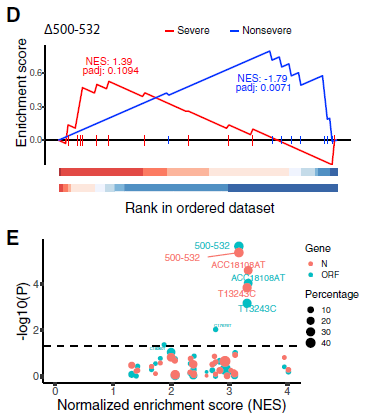 采用類似GSEA的分析方法,來鑒定一個突變體是否富集嚴(yán)重/非嚴(yán)重的臨床表型。發(fā)現(xiàn)Δ500-532與ESR等嚴(yán)重相關(guān)表型呈負(fù)相關(guān)?;谟?沒有某種變異類型,將病例分為兩組,發(fā)現(xiàn)感染Δ500 -532病毒的患者在所有檢測的35種變異中Ct值最高(圖3E)。