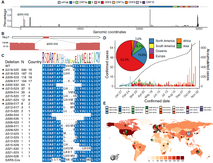 計算了SARS-CoV-2基因組中每個堿基對的缺失頻率,Δ500-532位點是第五大最常見的缺失區(qū)域(圖4A)。測序結(jié)果支持高序列深度的缺失,并通過Sanger測序驗證了缺失(圖4B)。從GISAID的37個國家的922例病例中,在Δ500-532位點找到了24種缺失變異(圖4C)。其中62.5%和19.8%分別來自歐洲和北美(圖4D),主要變種為Δ518-520 (Δ1aa), Δ518-523 (Δ2aa)和Δ509-523(Δ5aa)(圖4E)。因此,研究結(jié)果顯示SARS-CoV-2基因組中存在一個缺失熱點,相關(guān)病例數(shù)量在全球范圍內(nèi)穩(wěn)步上升。