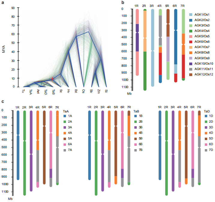 通過(guò)比較威寧黑麥、烏拉爾圖小麥、節(jié)節(jié)麥、普通小麥(亞基因組TaA、TaB和TaD)、大麥、水稻Os(Oryza sativa ssp.?japonica)、二穗短柄草Bd(Brachypodium distachyon)、玉米Zm(Zea mays)、高粱Sb(Sorghum bicolor)、谷子Si(Setaria italica)基因組,共找到2517個(gè)單拷貝同源基因。通過(guò)對(duì)單拷貝基因組構(gòu)建進(jìn)化樹和計(jì)算分化時(shí)間發(fā)現(xiàn),在大麥和小麥分化后(15MYA)黑麥和二倍體小麥發(fā)生了分化(9.6 MYA) (Fig. 3a)。