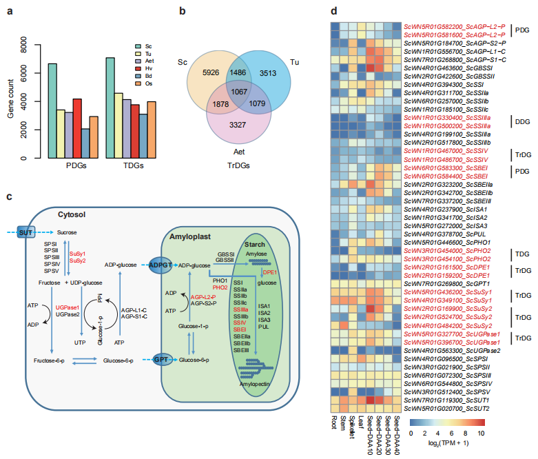 接下來(lái)作者研究了黑麥淀粉生物合成相關(guān)基因(SBRGs)中的基因復(fù)制。研究發(fā)現(xiàn)這些重復(fù)類型在黑麥淀粉生物合成相關(guān)基因(SBRGs)中普遍存在,并且不同的SBRG的復(fù)制基因之間往往表現(xiàn)出表達(dá)差異,說(shuō)明不同類型的基因復(fù)制可以豐富黑麥基因在重要生物過(guò)程中的遺傳多樣性(圖4c),這些黑麥SBRGs的新變化可能為調(diào)控植物淀粉生物合成和性質(zhì)提供新的酶活性,因此解析全套黑麥SBRGs有利于提高黑麥的產(chǎn)量潛力和營(yíng)養(yǎng)品質(zhì)。