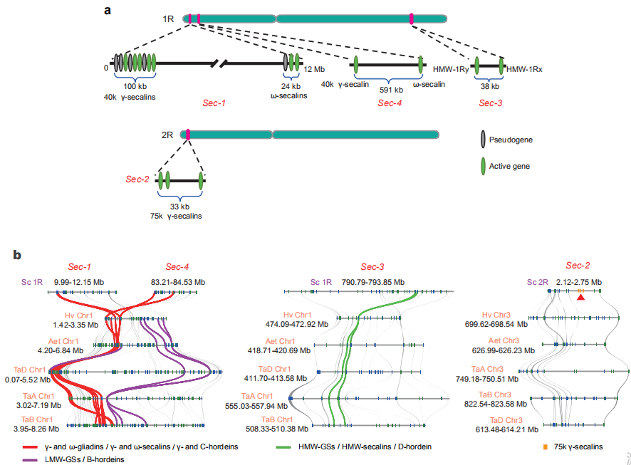 在威寧黑麥中未發(fā)現(xiàn)小麥低分子量麥谷蛋白亞基(LMW-GSs)或大麥B-hordein的同源序列(圖5b),表明在黑麥進(jìn)化過(guò)程中攜帶這些基因的染色體片段缺失,這可能是1BL1RS易位系小麥品種中,品質(zhì)受影響的主要原因。并且在威寧黑麥基因組中未發(fā)現(xiàn)α-醇溶蛋白基因,這說(shuō)明小麥及其近緣種的α-醇溶蛋白(α-gliadin)基因可能在小麥和黑麥分化之后進(jìn)化產(chǎn)生的。這些SSP分析結(jié)果闡明了黑麥堿基因座的結(jié)構(gòu)和組成,這將有助于進(jìn)一步研究黑麥、小黑麥和小麥的加工和營(yíng)養(yǎng)品質(zhì)。