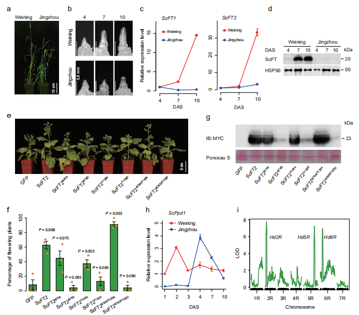 在長(zhǎng)日照條件下,威寧黑麥比荊州黑麥提前抽穗10-12天(圖6a),這與威寧黑麥莖尖分生組織發(fā)育更快有關(guān)(圖6b)。在威寧黑麥基因組中,注釋到在長(zhǎng)日照條件下高表達(dá)的兩個(gè)開花位點(diǎn)(FT)基因ScFT1(ScWN4R01G446100)和ScFT2(ScWN3R01G192500)。播種后7天和10天,ScFT1和ScFT2在威寧黑麥中的表達(dá)水平顯著高于荊州黑麥(圖6c),且ScFT蛋白在黑麥中積累到相對(duì)較高水平,而荊州黑麥中幾乎沒(méi)有(圖6d)。檢測(cè)到的ScFT蛋白的大小(~29 kDa)比預(yù)測(cè)出的ScFT1和ScFT2的分子量大(~19 kDa)(圖6d),表明ScFT蛋白具有潛在的翻譯后修飾。用高效檢測(cè)磷蛋白的磷酸標(biāo)記SDS-PAGE分析表明,威寧黑麥中ScFT確實(shí)發(fā)生了翻譯后磷酸化修飾。