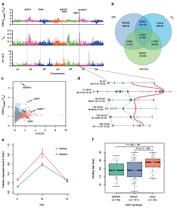 對(duì)馴化基因的分析可以促進(jìn)對(duì)作物性狀的理解和改良,但在黑麥中這類基因的分子分析方面進(jìn)展甚微。作者通過(guò)全基因組選擇清除分析,利用在栽培黑麥和瓦維洛夫黑麥(S. vavilovii)之間鑒定的123647個(gè)SNPs,挖掘黑麥馴化相關(guān)染色體區(qū)域和基因座。DRI、FST、XP-CLR分析中,共同識(shí)別到11個(gè)選擇信號(hào)(圖7a-c)。通過(guò)與水稻和大麥的共線性比較,發(fā)現(xiàn)了一些可能的選擇清除位點(diǎn),包括已在水稻或大麥中已被功能分析的ScBC1、ScBtr、ScGW2、ScMOC1、ScID1和ScWx的同源基因(圖7a-c)。
