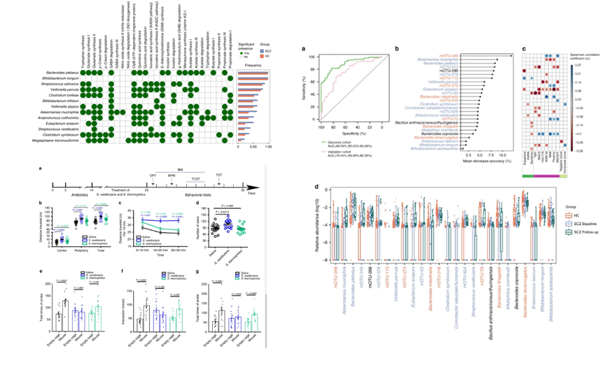 本文中研究者分析了90名無藥物治療精神分裂癥患者和81名健康對照者的糞便微生物組,確定了一種能夠區(qū)分患者和對照者的微生物物種分類器。研究者發(fā)現(xiàn)與精神分裂癥相關(guān)的功能性潛能包括短鏈脂肪酸合成、色氨酸代謝以及神經(jīng)遞質(zhì)的合成/降解等方面的差異。Streptococcus vestibularis(精神分裂癥中比較富集的細(xì)菌)的移植會(huì)引起小鼠的社交行為缺陷,并改變小鼠外周組織中神經(jīng)遞質(zhì)的水平。本文為隊(duì)列研究和動(dòng)物模型的進(jìn)一步研究提供了新的線索。