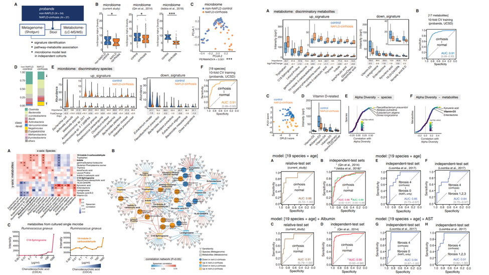 研究表明,腸道菌群失調(diào)與非酒精性脂肪性肝病(non-alcoholicfatty liver disease, NAFLD)進(jìn)展為晚期纖維化和肝硬化密切相關(guān)。為了進(jìn)一步確定上述關(guān)聯(lián)在臨床上的診斷能力,研究比較了163名來自對照和患病家庭成員的糞便微生物組,包括非NAFLD患者、NAFLD合并肝硬化患者及其一級(jí)親屬。通過對宏基因組和非靶向代謝組使用隨機(jī)森林機(jī)器學(xué)習(xí)算法和差異豐度分析,確定了用于檢測肝硬化有效的獨(dú)立的宏基因組和代謝組標(biāo)志物,診斷準(zhǔn)確率(AUC) 可達(dá)0.91。結(jié)合年齡和血清蛋白水平的宏基因組特征,可準(zhǔn)確區(qū)分在生理上和遺傳上不同的隊(duì)列中的肝硬化。該研究發(fā)現(xiàn)的這種通用的腸道微生物組衍生的標(biāo)志物,可以準(zhǔn)確地識(shí)別肝硬化,這在醫(yī)療資源有限的情況下對改善疾病診斷具有巨大的潛力。