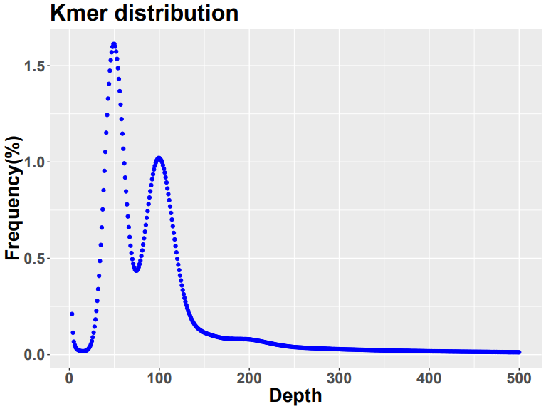 Figure 1,一個(gè)二倍體的kmer頻率-深度分布圖,橫軸為深度,縱軸為kmer出現(xiàn)的頻率,主峰位于深度100左右,雜合峰位于深度50左右