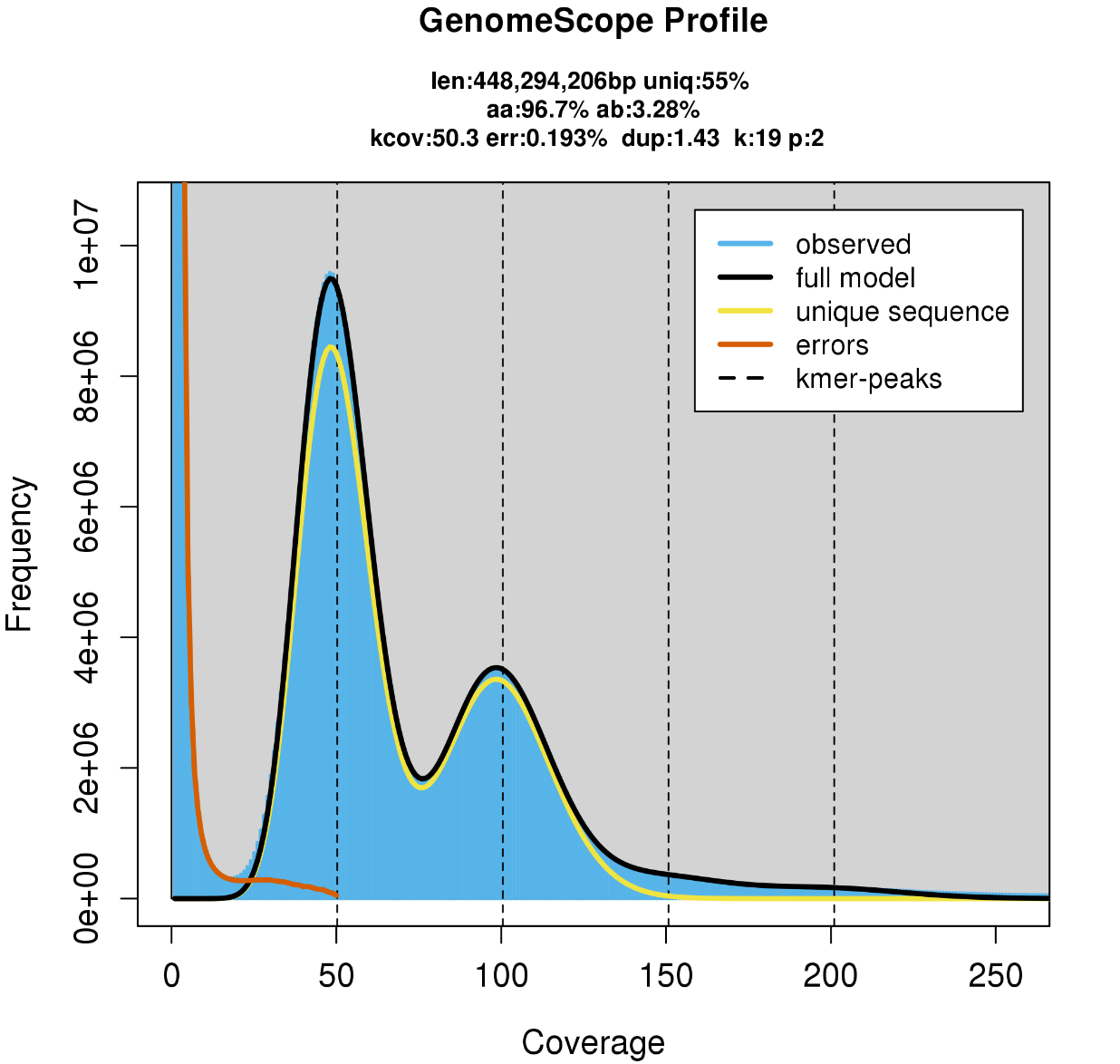 - 黃色擬合線被認(rèn)為來(lái)自基因組非重復(fù)區(qū)域的K-mer分布;
