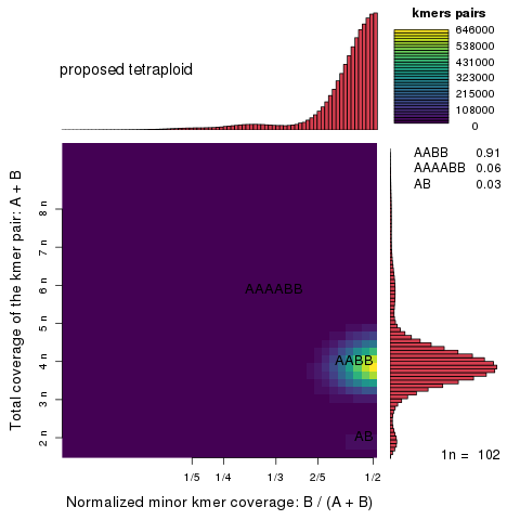 Figure 4一個(gè)四倍體的smudgeplot分析結(jié)果,橫軸是雜合k-mer對(duì)的深度占總深度的比例,縱軸是所有k-mer對(duì)的總深度,二者的交點(diǎn)即代表了不同的雜合結(jié)構(gòu)。交點(diǎn)的亮度代表了落入其中的k-mer數(shù)。