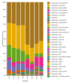 物種豐度柱狀圖:每個柱子表示一個樣品,一種顏色代表一個物種,色塊長度表示物種所占相對豐度比例。通過物種分布柱狀圖即可以展示各樣品優(yōu)勢物種及組成,又可以清晰觀察到優(yōu)勢物種在不同樣品種的豐度變化趨勢。