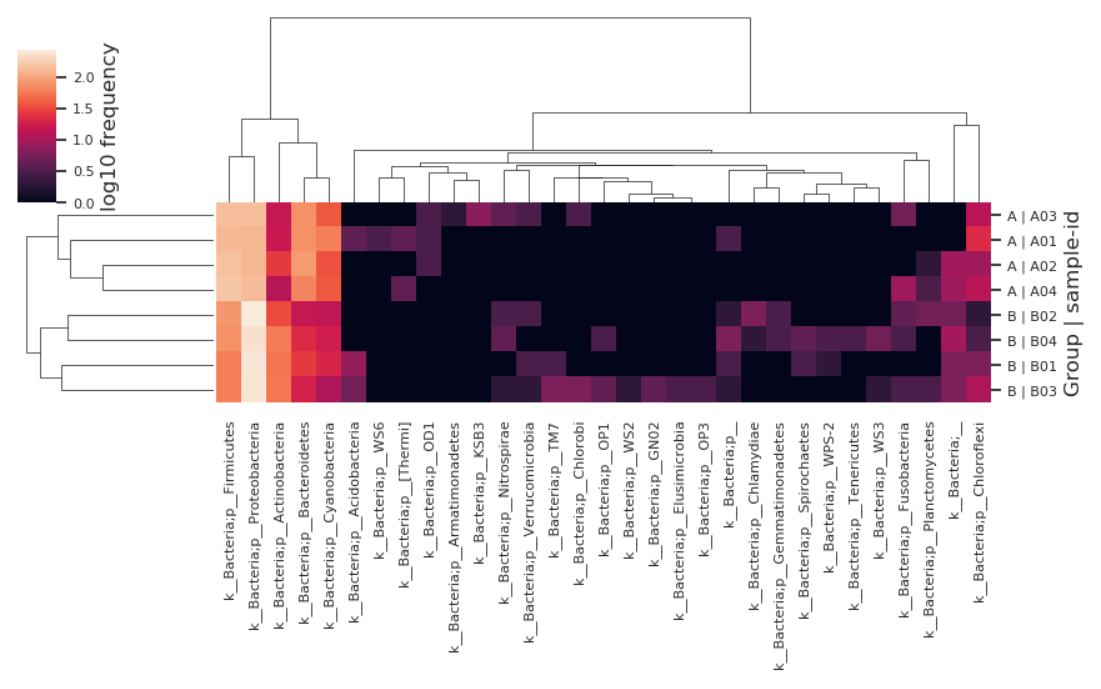 物種豐度聚類熱圖:以顏色梯度來代表數(shù)據(jù)矩陣中數(shù)值的大小并根據(jù)物種或樣品豐度相似性進(jìn)行聚類的一種圖形展示方式。將高豐度和低豐度的物種分塊聚集,通過顏色梯度及相似程度來反映多個樣品群落組成的相似性和差異性。