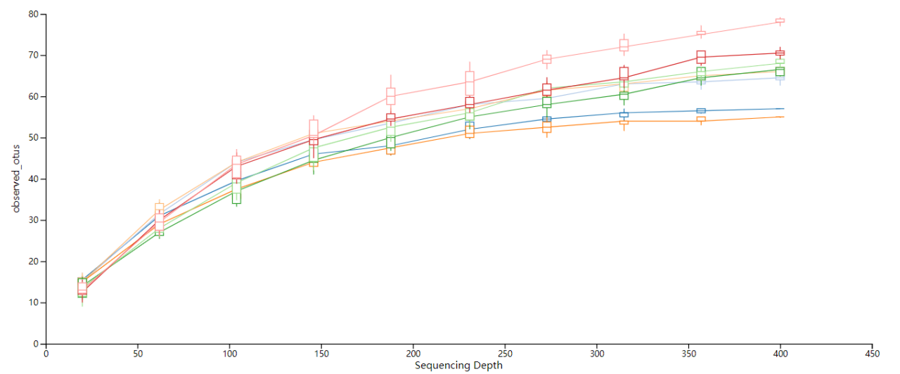 稀釋性分析:用于驗(yàn)證測序數(shù)據(jù)量是否足以反映樣品中的物種多樣性,并間接反映樣品中物種的豐富程度。在一定范圍內(nèi),隨著測序條數(shù)的加大,若曲線表現(xiàn)為急劇上升則表示群落中有大量物種被發(fā)現(xiàn);當(dāng)曲線趨于平緩,則表示此環(huán)境中的物種并不會隨測序數(shù)量的增加而顯著增多