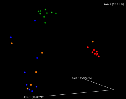 PCoA分析:原理是假設(shè)對N個樣品有衡量它們之間差異或距離的數(shù)據(jù),就可以用此方法找出一個直角坐標(biāo)系,將N個樣品表示成N個點(diǎn),而使點(diǎn)間的歐式距離的平方正好等于原來的差異數(shù)據(jù),實(shí)現(xiàn)定性數(shù)據(jù)的定量轉(zhuǎn)換,從多維數(shù)據(jù)中提取出主要的元素和結(jié)構(gòu)。