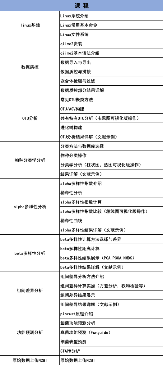 想學(xué)習(xí)如何分析微生物多樣性數(shù)據(jù)?想了解每步操作參數(shù)的意義?百邁客針對老師們對微生物多樣性內(nèi)容的需求,特開辦微生物多樣性生信課程,面向全體科研工作者,系統(tǒng)學(xué)習(xí)微生物多樣性分析中常規(guī)內(nèi)容與分析過程。課程設(shè)計(jì)覆蓋linux基本操作、QIIME2數(shù)據(jù)分析、百邁客云分析三部分內(nèi)容。