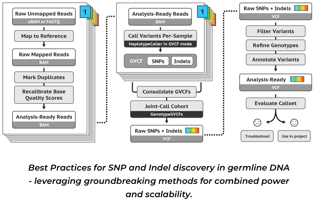 GATK全稱是The Genome Analysis Toolkit,是Broad Institute(The Broad Institute, formerly the Broad Institute of MIT and Harvard, evolved from a decade of research collaborations among MIT and Harvard scientists.)開發(fā)的用于二代重測序數(shù)據(jù)分析的一款軟件,里面包含了很多有用的工具,主要注重與變異的查找,基因分型且對于數(shù)據(jù)質(zhì)量保證高度重視。GATK是目前業(yè)內(nèi)使用較廣的基因數(shù)據(jù)變異檢測工具。本次課程基于GATK的Best?Practices,實現(xiàn)從原始的比對結果開始,到最終的高質(zhì)量突變位點的完整信息分析流程。