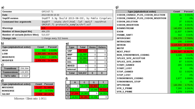 SnpEff 軟件通過基因組結構注釋數(shù)據(jù)(GTF/GFF文件),對VCF文件中的SNP/InDel信息進行注釋,即主要解釋了SNP/InDel是否能夠?qū)幋a蛋白基因造成影響。SnpEff自帶大量已經(jīng)發(fā)表的基因組的信息,可以快速利用已發(fā)表的基因組信息進行SNP/InDel位點的注釋分析。對于未收錄的基因組,SnpEff也提供了標準流程來構建對應的分析數(shù)據(jù)庫。