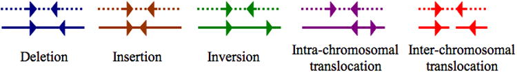 高通量測序數(shù)據(jù)除了可以分析SNP/InDel位點外,還可以利用雙端測序的中的插入片段長度信息和比對時出現(xiàn)的異常比對結果,對測序樣本中可能存在的結構變異進行分析。本次課程主要利用BreakDancer這款軟件進行結構變異位點的分析,軟件主要預測了五種類型的結構變異:插入、缺失、倒位、染色體間和染色體內(nèi)易位,