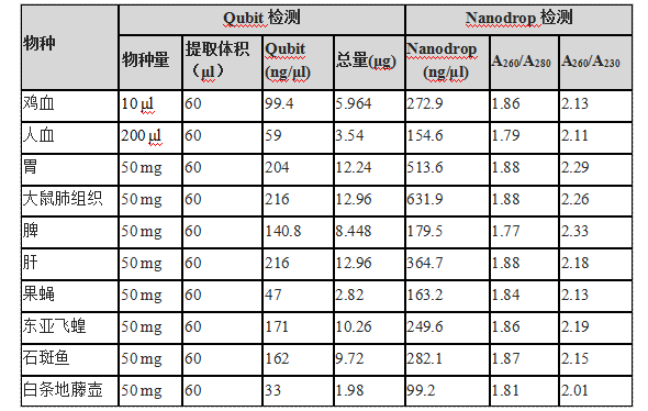 表1:用Qubit檢測(cè)DNA的濃度,以及用Nanodrop檢測(cè)DNA在260 nm的吸光度。