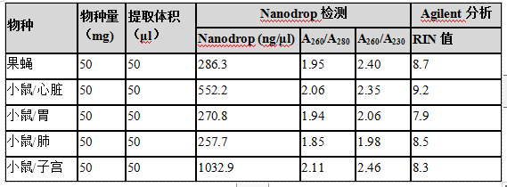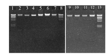 結(jié)論:條帶明亮清晰無(wú)拖尾現(xiàn)象,表明提取的血液、動(dòng)物組織、細(xì)胞的DNA完整性好。