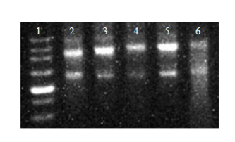 Lane 1:250 bp DNA Marker?;Lane 2:小鼠/子宮;Lane 3:小鼠/肺;Lane 4:小鼠胃;Lane 5:小鼠/心臟;Lane 6:果蠅。