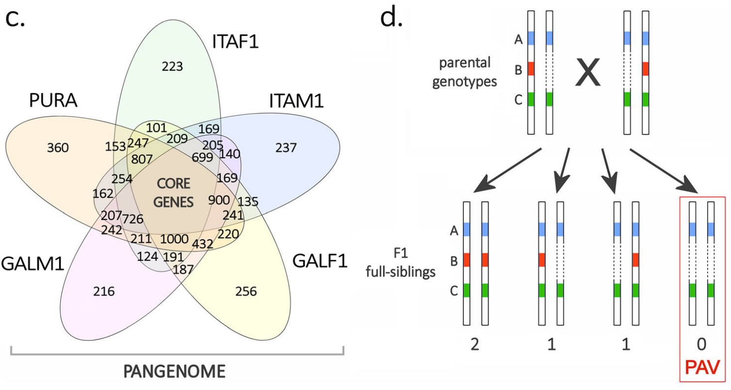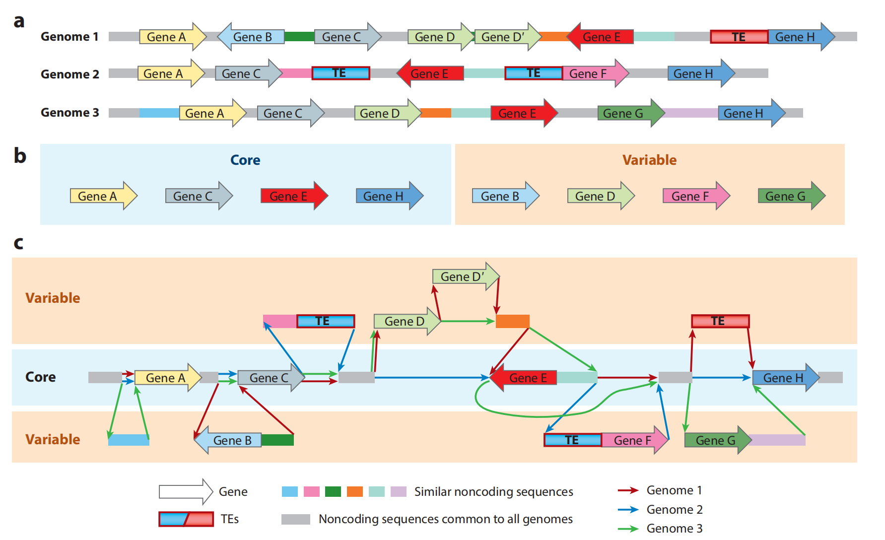因此對(duì)于一個(gè)物種來(lái)說(shuō),如果只使用單一的參考基因組進(jìn)行遺傳馴化變異的研究,可能會(huì)丟失掉很多有意義的基因信息。以上種種因素,共同推動(dòng)了動(dòng)植物泛基因組的構(gòu)建與研究。