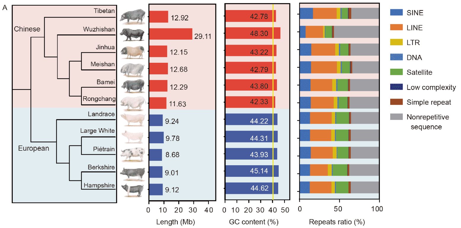 圖6 豬基因組特征及泛基因組A/B Compartment、TAD分布