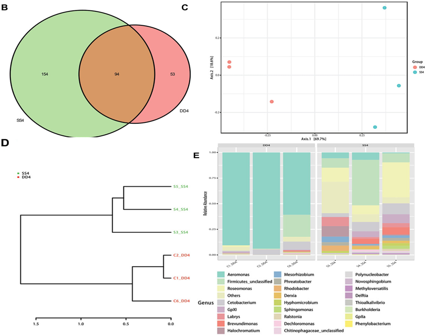 測(cè)序樣品:養(yǎng)殖5個(gè)月后,隨機(jī)各抽取3條魚(yú)(饑餓24小時(shí)),將腸分為前腸、中腸和后腸段,并用鑷子擠壓將每個(gè)片段的內(nèi)容物收集到無(wú)菌的2ml收集管中(DD4指對(duì)照組樣本,SS4指實(shí)驗(yàn)組樣本)。對(duì)應(yīng)的同一樣本腸道組織用于轉(zhuǎn)錄組測(cè)序(CT指對(duì)照組樣本,ST指實(shí)驗(yàn)組樣本)。