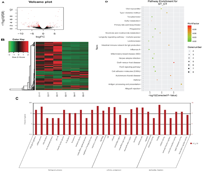 使用與16S測(cè)序相同的樣本對(duì)黃河鯉新品種(實(shí)驗(yàn)組)和對(duì)照組中的轉(zhuǎn)錄組進(jìn)行測(cè)序并鑒定差異基因(DEG)。在249個(gè)顯著DEGs中(如圖3A),194個(gè)基因表達(dá)下調(diào),55個(gè)基因表達(dá)上調(diào)。通過(guò)GO注釋,這些基因被分為以下功能類別:生物調(diào)節(jié)、細(xì)胞過(guò)程、解毒作用、發(fā)育過(guò)程、免疫系統(tǒng)進(jìn)程等(都屬于生物過(guò)程);細(xì)胞、細(xì)胞部分、胞外區(qū)域、胞外區(qū)域部分、大分子復(fù)合物等(細(xì)胞成分);抗氧化活性、結(jié)合活性、催化活性、分子功能調(diào)節(jié)器上等(分子功能)。聚類分析表明,實(shí)驗(yàn)組和對(duì)照組具有不同的特征,DEG分為四個(gè)部分(圖3B)。這些基因的GO注釋包括生物學(xué)過(guò)程中的13個(gè)類別,細(xì)胞成分中的8類和分子功能類別中的7類(圖3C)。KEGG注釋將這些基因中的大部分分配到免疫相關(guān)途徑(圖3D)。