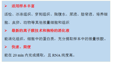 總之,從微量細胞、組織樣本中提取的RNA,具有較高的濃度和純度,且良好的完整性。可以直接應用于Northern 雜交、RT-PCR、qPCR、體外翻譯等各種常規(guī)分子生物學實驗。