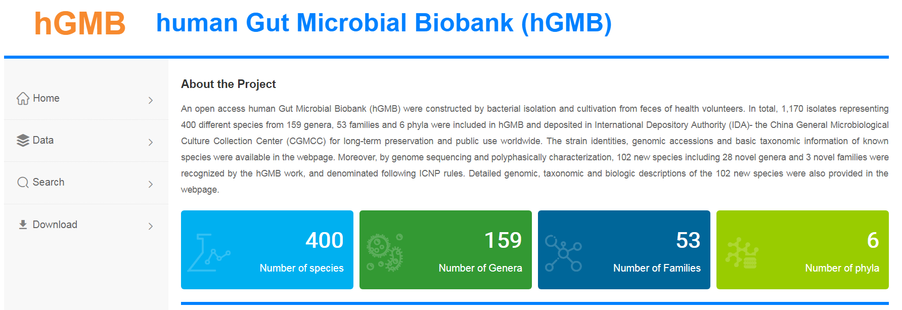2021年5月,中科院微生物所通過從健康志愿者糞便中分離培養(yǎng)細(xì)菌,構(gòu)建了一個開放獲取的人類腸道微生物庫(hGMB)。數(shù)據(jù)庫共有1170個菌株,代表6門53科159屬400個不同物種。并保存在國際保存機構(gòu)(IDA)-中國微生物培養(yǎng)總收集中心(CGMCC),以便在全球范圍內(nèi)長期保存和公共使用。該網(wǎng)站提供了已知物種的菌株身份、基因組材料和基本分類信息。根據(jù)國際原核生物命名規(guī)則,對102個新種進(jìn)行了特征描述和命名,提出了28個新屬和3個新科。hGMB代表了全球人類腸道16S rRNA基因擴增子數(shù)據(jù)(n=11647)中80%以上的常見和優(yōu)勢人類腸道微生物屬和種。