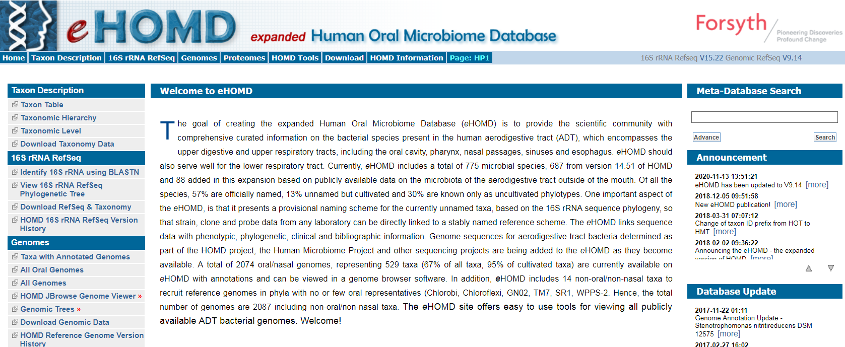 目前,eHOMD共包括775種微生物,其中687種來自HOMD 14.51版,88種是根據(jù)口外空氣消化道微生物群的公開可用數(shù)據(jù)在本次擴展中添加的。在所有物種中,57%是正式命名的,13%是未命名的(但可人工培養(yǎng)),30%是無人工培養(yǎng)型。eHOMD將序列數(shù)據(jù)與表型、系統(tǒng)發(fā)育、臨床和文獻(xiàn)信息聯(lián)系起來,共有2074個口腔/鼻腔基因組,代表529個分類群(占所有分類群的67%,占培養(yǎng)分類群的95%)。目前可在eHOMD上獲得,并帶有注釋,可在基因組瀏覽器軟件中查看。作為HOMD項目、人類微生物組項目和其他測序項目的一部分確定的空氣消化道細(xì)菌的基因組序列將在可用時添加到eHOMD中。更新時間為2020-11-13?版本V9.14。