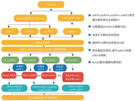 百邁客全轉(zhuǎn)錄組測(cè)序服務(wù)是一次檢測(cè),獲得四種分子(mRNA、lncRNA、circRNA、miRNA)信息,針對(duì)不同類(lèi)型的RNA進(jìn)行表達(dá)分析,結(jié)構(gòu)研究以及全新轉(zhuǎn)錄本的發(fā)現(xiàn),并結(jié)合競(jìng)爭(zhēng)性?xún)?nèi)源RNA(ceRNA)機(jī)制,進(jìn)行聯(lián)合分析,深入挖掘轉(zhuǎn)錄水平調(diào)控網(wǎng)絡(luò),深度探究各類(lèi)RNA分子的調(diào)控機(jī)制。分析內(nèi)容如下: