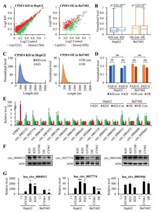 由于CPSF4負(fù)責(zé)PAS剪切,因此本研究假設(shè)CPSF4的增加加速了circRNA的降解并降低了它們?cè)贖CC細(xì)胞中的水平。為了驗(yàn)證這一假設(shè),提取CPSF4-KD HepG2細(xì)胞、CPSF4-OE Bel7402細(xì)胞及其陰性對(duì)照的總RNA,并通過(guò)高通量測(cè)序進(jìn)行分析。結(jié)果顯示,在CPSF4-OE細(xì)胞中檢測(cè)到下調(diào)circRNA(1058)多于上調(diào)circRNA(821),并且circRNA的平均表達(dá)水平顯著降低。相比之下,CPSF4-KD細(xì)胞中大多數(shù)circRNA(5005個(gè)circRNA中的3221個(gè))上調(diào),circRNA的平均表達(dá)水平顯著增加(圖2A,B)。通過(guò)生物信息學(xué)分析發(fā)現(xiàn),CPSF4主要抑制外顯子circRNA,只有一小部分circRNA是內(nèi)含子或內(nèi)含子-外顯子circRNA。CPSF4-OE細(xì)胞和CPSF4-KD細(xì)胞中circRNA的長(zhǎng)度分布均未改變(圖 2C),但CPSF4調(diào)節(jié)后的circRNA變化依賴(lài)于PAS。首先,在4種細(xì)胞系中,含有PAS的circRNA的表達(dá)顯著低于不含PAS的circRNA;其次,CPSF4-KD細(xì)胞含有PAS序列的circRNA明顯上調(diào),但在沒(méi)有PAS序列的circRNA中沒(méi)有檢測(cè)到變化(圖 2D)。而在CPSF4-OE細(xì)胞中帶有或不帶有PAS序列的circRNA都減少了,推測(cè)在高表達(dá)水平CPSF4的存在下,除了6個(gè)傳統(tǒng)PAS序列之外的一些非特異性PAS序列也可以被剪接。